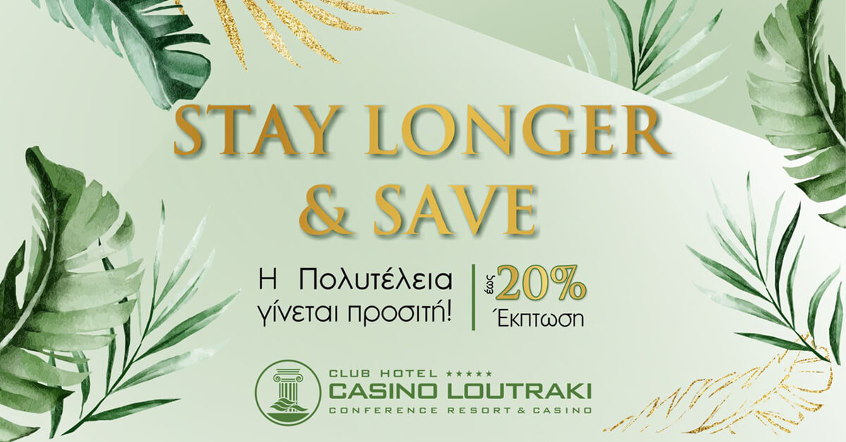 Ανακαλύψτε την απόλαυση του να παρατείνετε τη διαμονή σας με στυλ. Με την προσφορά Stay Longer and Save, το Club Hotel Loutraki σας προσκαλεί να απολαύσετε μια ξεχωριστή εμπειρία διαμονής με τη νέα του προσφορά για πολυήμερη παραμονή. Αν σχεδιάζετε να μείνετε κοντά μας για τουλάχιστον 5 νύχτες, επωφεληθείτε από έκπτωση έως 20% και ζήστε την άνεση και την εξυπηρέτηση που χαρακτηρίζουν την αυθεντική ελληνική φιλοξενία.